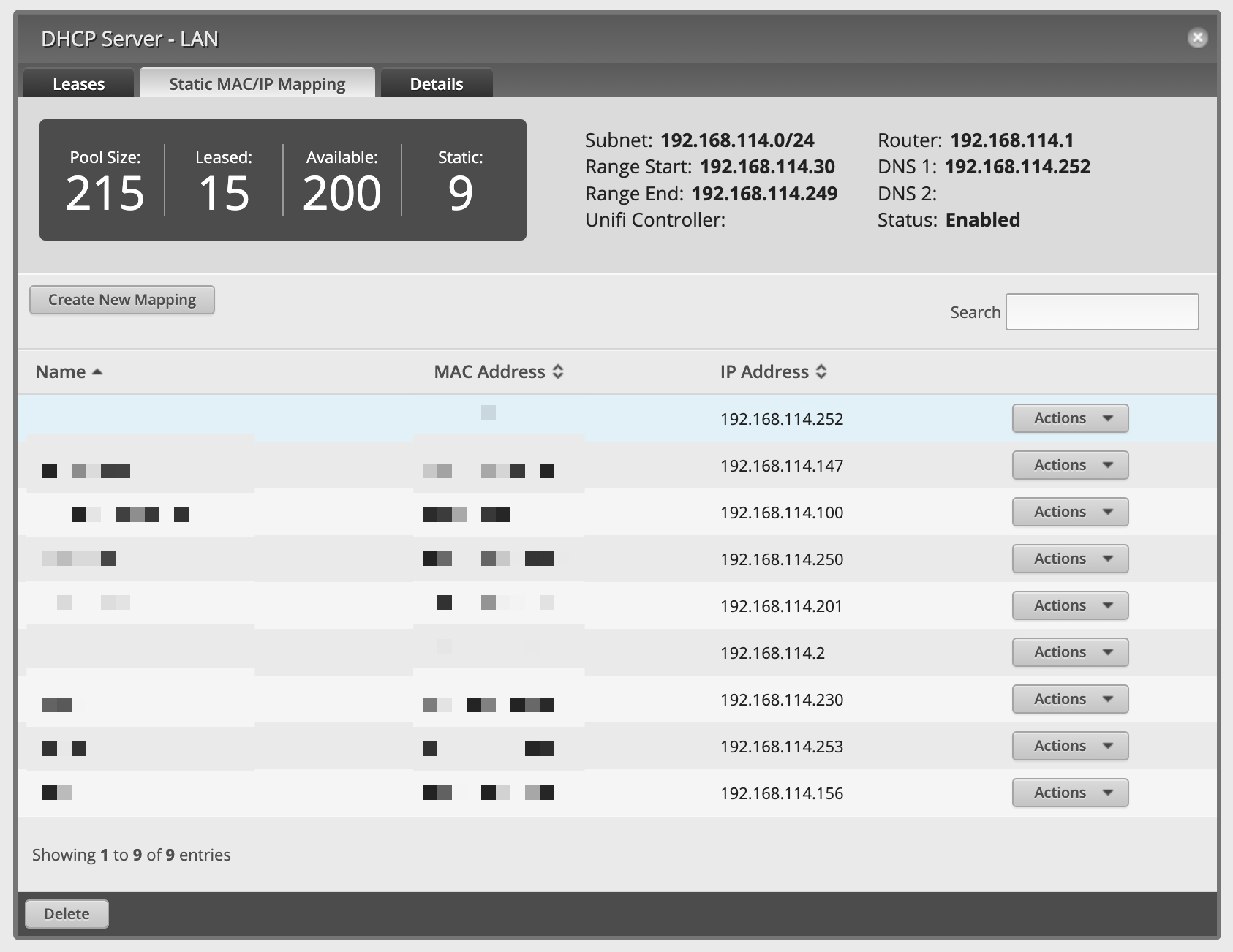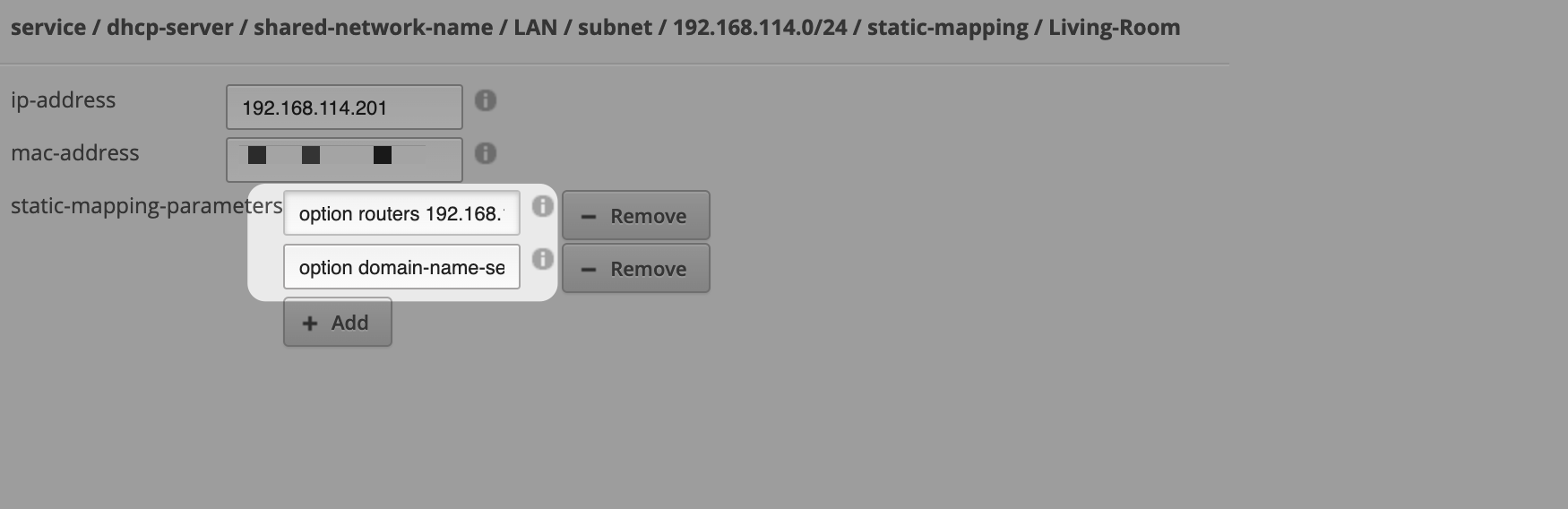 在 service / dhcp-server / shared-network-name / LAN / subnet / 192.168.114.0/24 / static-mapping 下找到你要配置的设备。