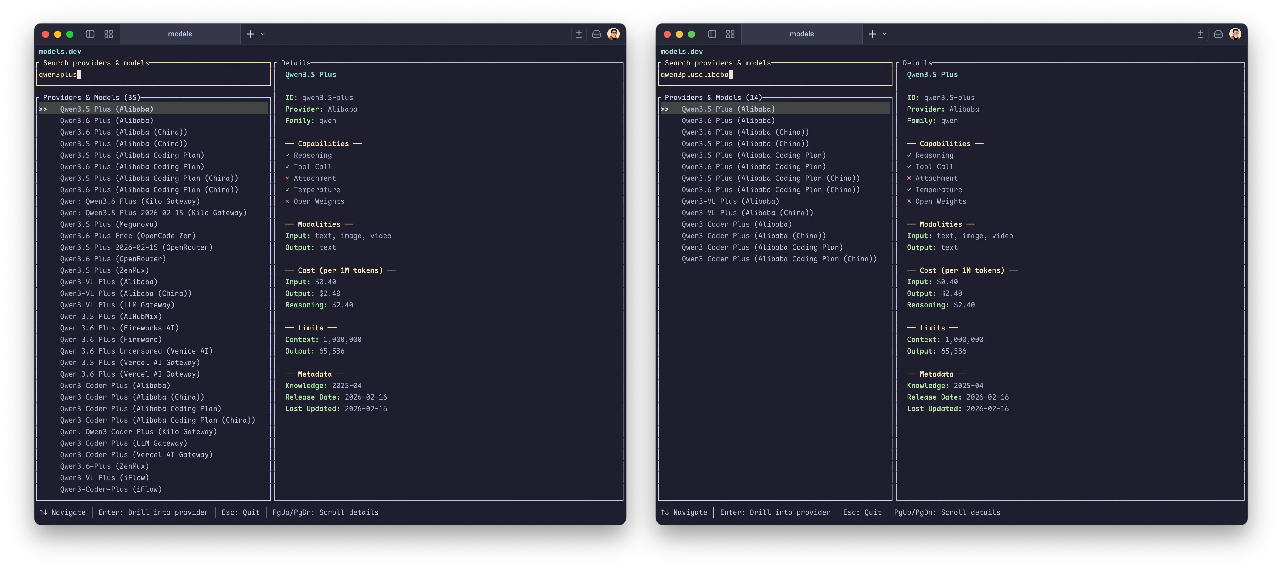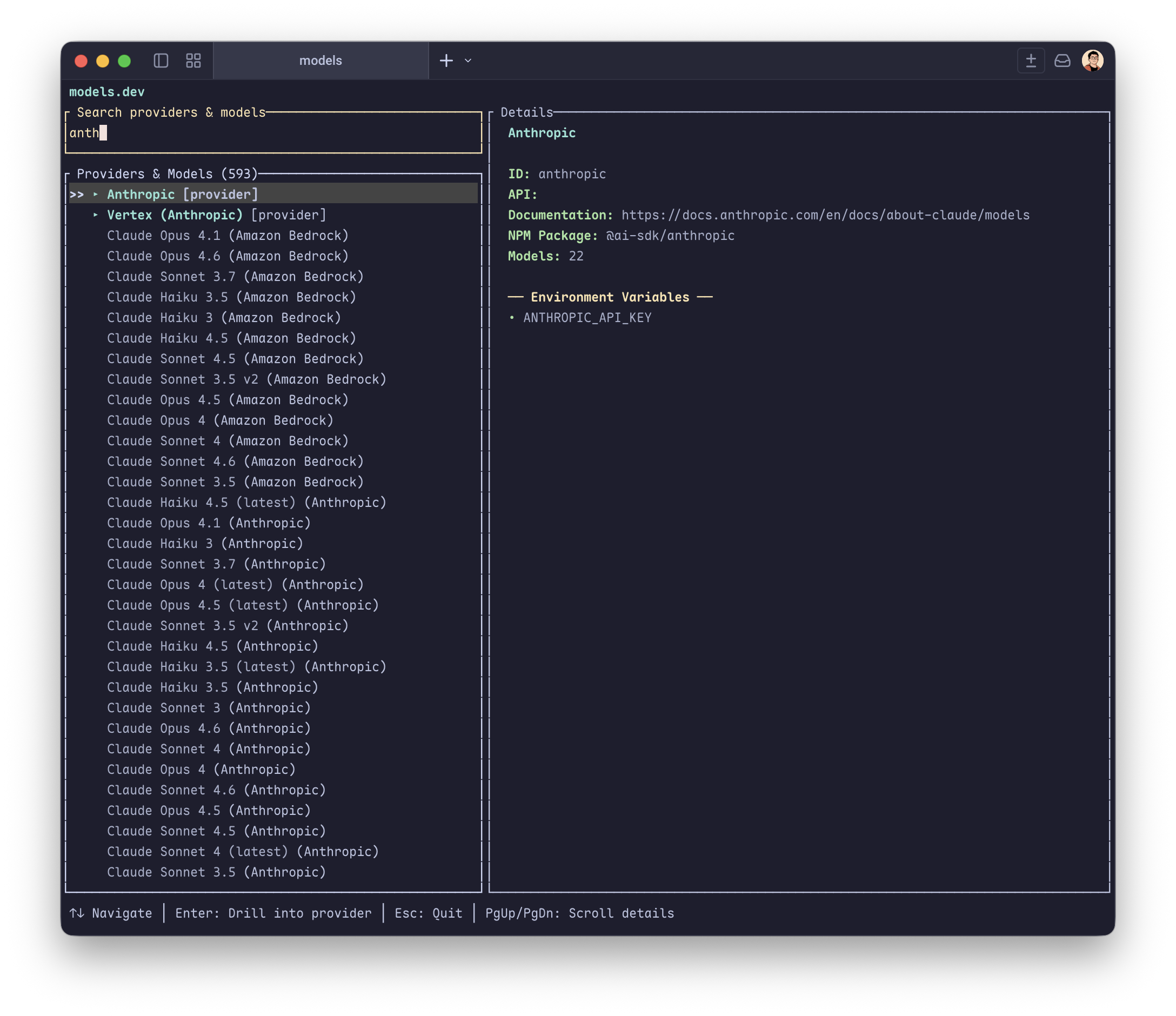models.dev 是一个很棒的网站,但是随着模型越来越多网站的性能变得越来越糟糕。这个命令行工具读取 models.dev 维护的数据库,提供模糊搜索和信息查看。